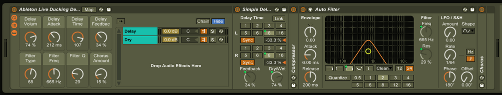 This Ableton Live ducking delay effects rack has the ability to add a ducking delay to your audio track. Ducking delays are delays that only raise in volume when vocals or other instruments are not playing. Then the delays are quieted when the vocals or instruments sound is heard in the track. This happens automatically so that you don’t have to spend a lot of time programming delay automation.